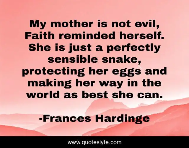 This page presents the quote "My mother is not evil, Faith reminded herself. She is just a perfectly sensible snake, protecting her eggs and making her way in the world as best she can.". Author of this quote is Frances Hardinge. This quote is about mothers-and-daughters, mothers,.