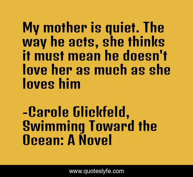 This page presents the quote "My mother is quiet. The way he acts, she thinks it must mean he doesn't love her as much as she loves him". Author of this quote is Carole Glickfeld, Swimming Toward the Ocean: A Novel. This quote is about actions, love, quiet, affection,.