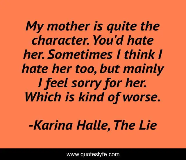 This page presents the quote "My mother is quite the character. You'd hate her. Sometimes I think I hate her too, but mainly I feel sorry for her. Which is kind of worse.". Author of this quote is Karina Halle, The Lie. This quote is about character, mom, mother, the-lie, hate, karina-halle,.