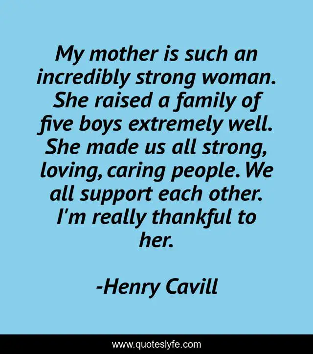 This page presents the quote "My mother is such an incredibly strong woman. She raised a family of five boys extremely well. She made us all strong, loving, caring people. We all support each other. I'm really thankful to her.". Author of this quote is Henry Cavill. This quote is about caring, family, mother,.