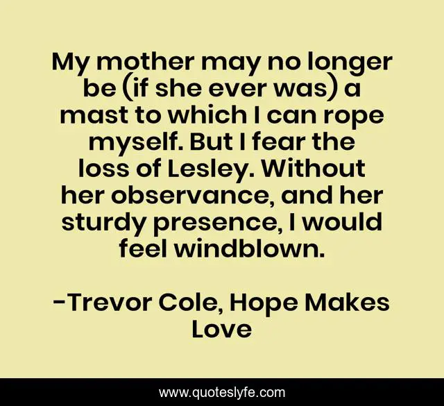 This page presents the quote "My mother may no longer be (if she ever was) a mast to which I can rope myself. But I fear the loss of Lesley. Without her observance, and her sturdy presence, I would feel windblown.". Author of this quote is Trevor Cole, Hope Makes Love. This quote is about mothers-and-daughters, comfort, guilt, forgiveness, regrets, metaphors,.