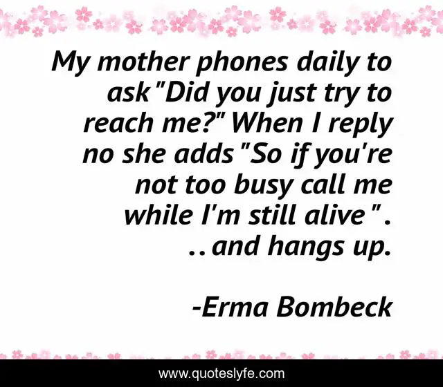 This page presents the quote "My mother phones daily to ask "Did you just try to reach me?" When I reply no she adds "So if you're not too busy call me while I'm still alive " . . . and hangs up.". Author of this quote is Erma Bombeck. This quote is about fathers, mothers,.