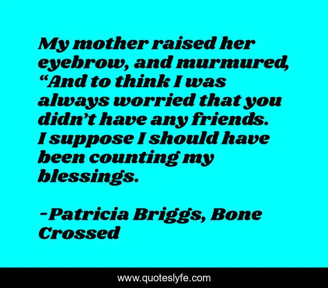 This page presents the quote "My mother raised her eyebrow, and murmured, “And to think I was always worried that you didn’t have any friends. I suppose I should have been counting my blessings.". Author of this quote is Patricia Briggs, Bone Crossed. This quote is about funny, blessings, friends, comedy, mother,.