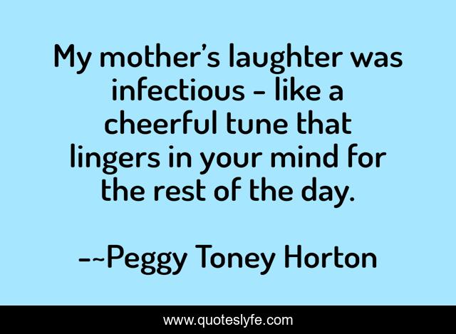 This page presents the quote "My mother’s laughter was infectious - like a cheerful tune that lingers in your mind for the rest of the day.". Author of this quote is ~Peggy Toney Horton. This quote is about laughter, cheerful-tune, lingers,.