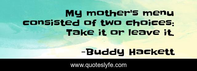 This page presents the quote "My mother's menu consisted of two choices: Take it or leave it.". Author of this quote is Buddy Hackett. This quote is about choice, mothers,.