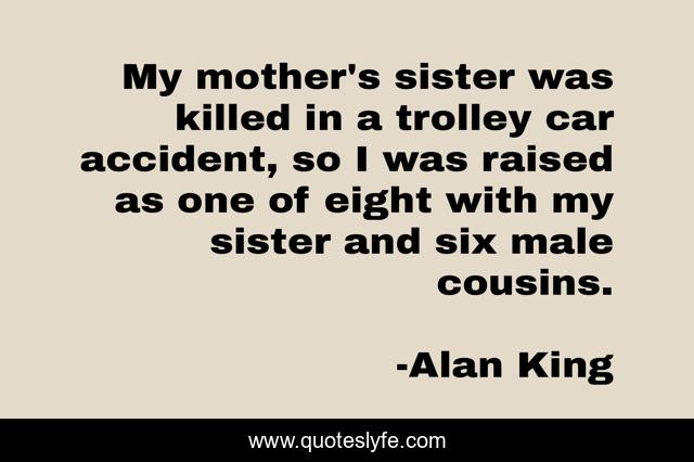 This page presents the quote "My mother's sister was killed in a trolley car accident, so I was raised as one of eight with my sister and six male cousins.". Author of this quote is Alan King. This quote is about cousins, sister, mother,.