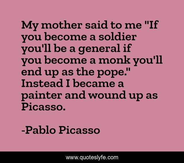 This page presents the quote "My mother said to me "If you become a soldier you'll be a general if you become a monk you'll end up as the pope." Instead I became a painter and wound up as Picasso.". Author of this quote is Pablo Picasso. .