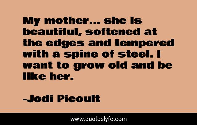 This page presents the quote "My mother... she is beautiful, softened at the edges and tempered with a spine of steel. I want to grow old and be like her.". Author of this quote is Jodi Picoult. This quote is about mothers, love, growing-up, affection, daughters,.