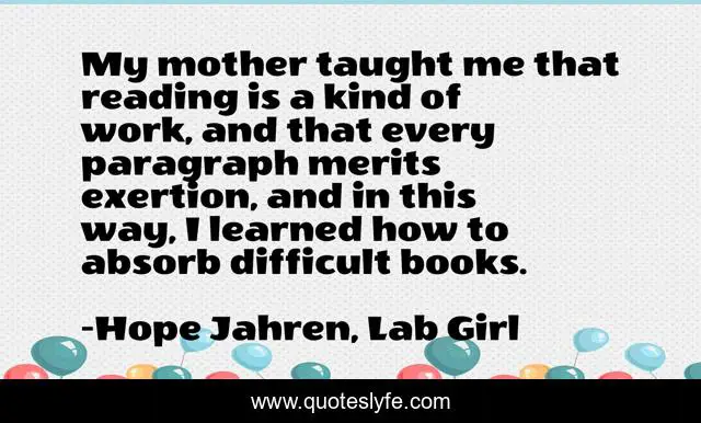 "Hope Jahren, Lab Girl Quotes." Quoteslyfe.com, 2025. Sat. 06 Dec. 2025. <https://www.quoteslyfe.com/quote/My-mother-taught-me-that-reading-is-66880>.