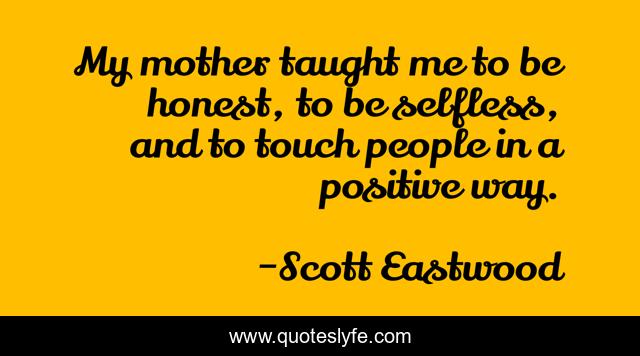 This page presents the quote "My mother taught me to be honest, to be selfless, and to touch people in a positive way.". Author of this quote is Scott Eastwood. This quote is about me, mother, people,.