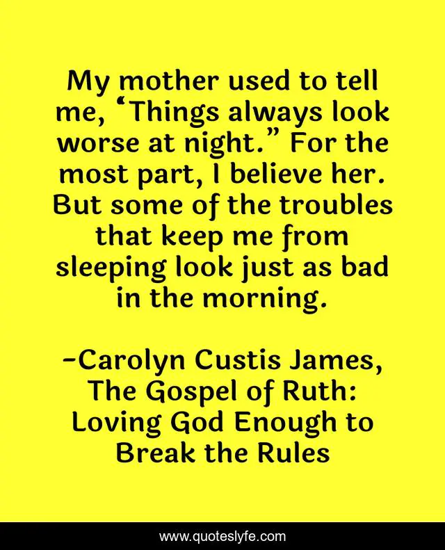 This page presents the quote "My mother used to tell me, “Things always look worse at night.” For the most part, I believe her. But some of the troubles that keep me from sleeping look just as bad in the morning.". Author of this quote is Carolyn Custis James, The Gospel of Ruth: Loving God Enough to Break the Rules. This quote is about problems, troubles,.
