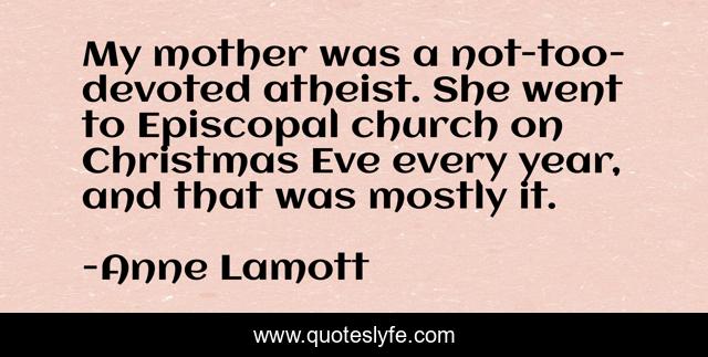 This page presents the quote "My mother was a not-too-devoted atheist. She went to Episcopal church on Christmas Eve every year, and that was mostly it.". Author of this quote is Anne Lamott. This quote is about mother, she, church,.