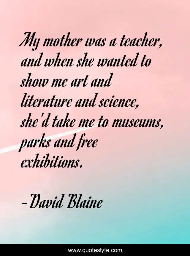 This page presents the quote "My mother was a teacher, and when she wanted to show me art and literature and science, she'd take me to museums, parks and free exhibitions.". Author of this quote is David Blaine. This quote is about art, teacher, mother,.