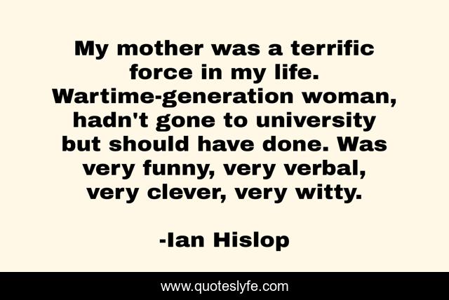 This page presents the quote "My mother was a terrific force in my life. Wartime-generation woman, hadn't gone to university but should have done. Was very funny, very verbal, very clever, very witty.". Author of this quote is Ian Hislop. This quote is about life, woman, mother,.