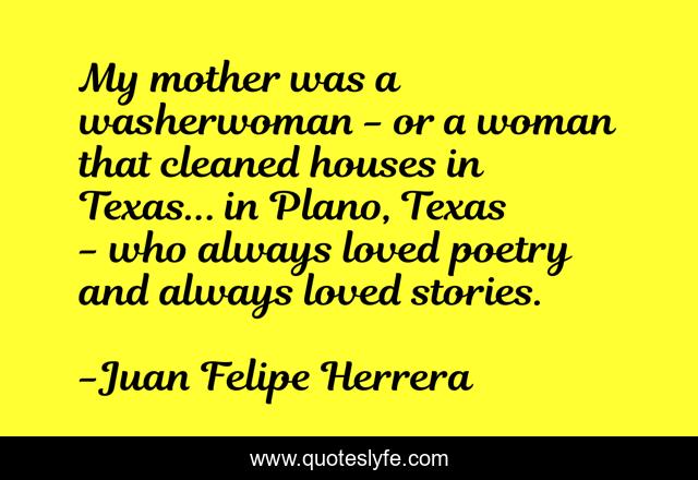 This page presents the quote "My mother was a washerwoman - or a woman that cleaned houses in Texas... in Plano, Texas - who always loved poetry and always loved stories.". Author of this quote is Juan Felipe Herrera. This quote is about loved, woman, mother,.
