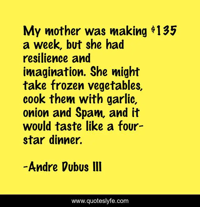 This page presents the quote "My mother was making $135 a week, but she had resilience and imagination. She might take frozen vegetables, cook them with garlic, onion and Spam, and it would taste like a four-star dinner.". Author of this quote is Andre Dubus III. This quote is about week, resilience, mother,.