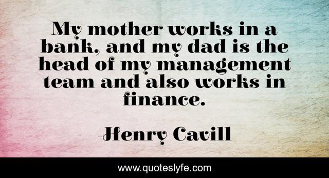 This page presents the quote "My mother works in a bank, and my dad is the head of my management team and also works in finance.". Author of this quote is Henry Cavill. This quote is about team, management, mother,.