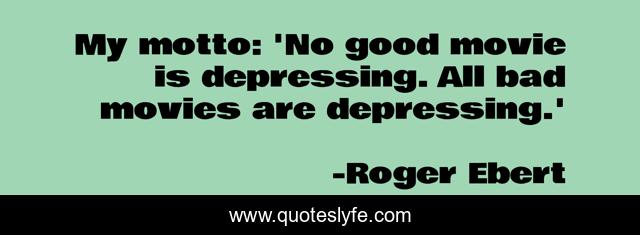 This page presents the quote "My motto: 'No good movie is depressing. All bad movies are depressing.'". Author of this quote is Roger Ebert. This quote is about motto, good, bad,.