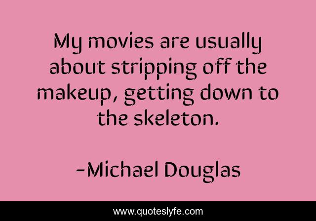 This page presents the quote "My movies are usually about stripping off the makeup, getting down to the skeleton.". Author of this quote is Michael Douglas. This quote is about down, makeup, skeleton,.