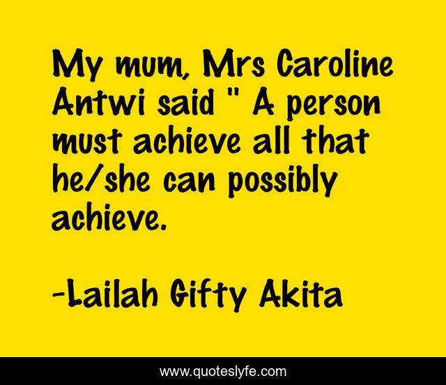 This page presents the quote "My mum, Mrs Caroline Antwi said '' A person must achieve all that he/she can possibly achieve.". Author of this quote is Lailah Gifty Akita. This quote is about believe-and-achieve, achieve-your-dreams, achiever, believe, achievement-and-attitude, achieve,.