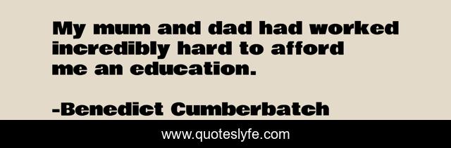 This page presents the quote "My mum and dad had worked incredibly hard to afford me an education.". Author of this quote is Benedict Cumberbatch. This quote is about dad, money, work, parents, mom, education,.