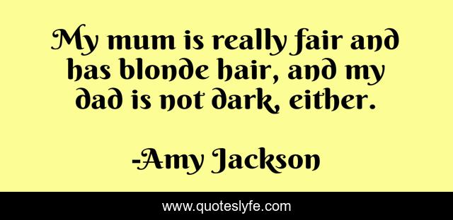 This page presents the quote "My mum is really fair and has blonde hair, and my dad is not dark, either.". Author of this quote is Amy Jackson. This quote is about hair, dark, blonde,.