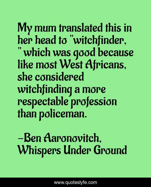 This page presents the quote "My mum translated this in her head to "witchfinder, " which was good because like most West Africans, she considered witchfinding a more respectable profession than policeman.". Author of this quote is Ben Aaronovitch, Whispers Under Ground. This quote is about west-african, witches, mothers,.