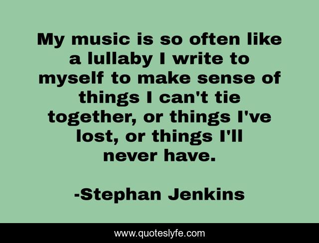 This page presents the quote "My music is so often like a lullaby I write to myself to make sense of things I can't tie together, or things I've lost, or things I'll never have.". Author of this quote is Stephan Jenkins. This quote is about myself, together, lost,.