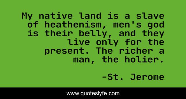 This page presents the quote "My native land is a slave of heathenism, men's god is their belly, and they live only for the present. The richer a man, the holier.". Author of this quote is St. Jerome. This quote is about god, live, man,.