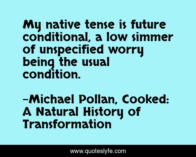 This page presents the quote "My native tense is future conditional, a low simmer of unspecified worry being the usual condition.". Author of this quote is Michael Pollan, Cooked: A Natural History of Transformation. This quote is about future, worry,.