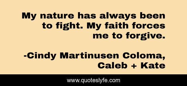 This page presents the quote "My nature has always been to fight. My faith forces me to forgive.". Author of this quote is Cindy Martinusen Coloma, Caleb + Kate. This quote is about faith, forgive, fight,.