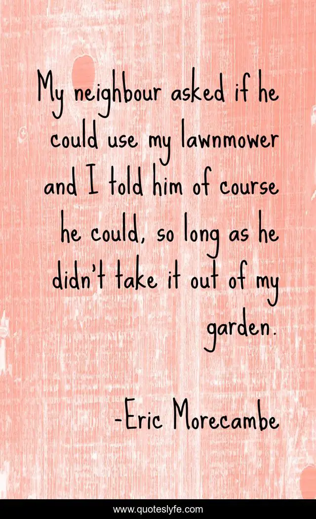 This page presents the quote "My neighbour asked if he could use my lawnmower and I told him of course he could, so long as he didn't take it out of my garden.". Author of this quote is Eric Morecambe. This quote is about garden, long, him,.