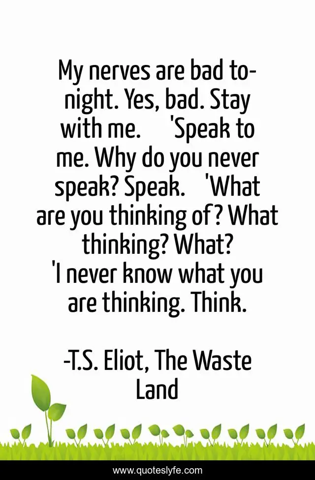This page presents the quote "My nerves are bad to-night. Yes, bad. Stay with me. 'Speak to me. Why do you never speak? Speak. 'What are you thinking of? What thinking? What? 'I never know what you are thinking. Think.". Author of this quote is T.S. Eliot, The Waste Land. .