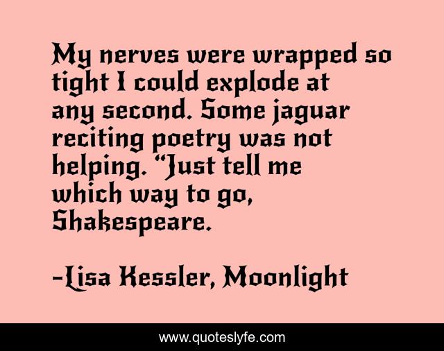 This page presents the quote "My nerves were wrapped so tight I could explode at any second. Some jaguar reciting poetry was not helping. “Just tell me which way to go, Shakespeare.". Author of this quote is Lisa Kessler, Moonlight. This quote is about moon-series, paranormal-romance, shifter, werewolf,.