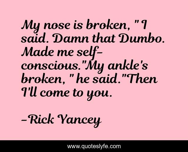 This page presents the quote "My nose is broken, " I said. Damn that Dumbo. Made me self-conscious."My ankle's broken, " he said."Then I'll come to you.". Author of this quote is Rick Yancey. This quote is about the-infinite-sea, boy, love, relationship, couple, girl, the-fifth-wave, affection,.