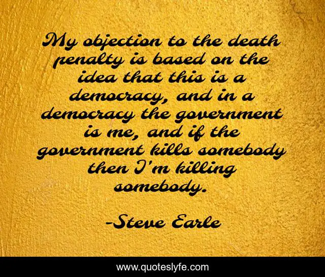 This page presents the quote "My objection to the death penalty is based on the idea that this is a democracy, and in a democracy the government is me, and if the government kills somebody then I'm killing somebody.". Author of this quote is Steve Earle. This quote is about me, democracy, government,.