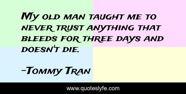 This page presents the quote "My old man taught me to never trust anything that bleeds for three days and doesn't die.". Author of this quote is Tommy Tran. This quote is about relationships, love, joke, laugh, humor, hate, affection, women,.