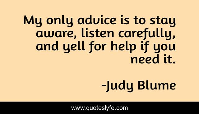 This page presents the quote "My only advice is to stay aware, listen carefully, and yell for help if you need it.". Author of this quote is Judy Blume. This quote is about enthusiasm, life, inspirational,.