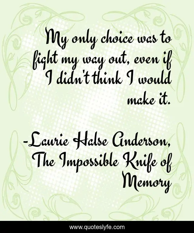 "Laurie Halse Anderson, The Impossible Knife of Memory Quotes." Quoteslyfe.com, 2025. Fri. 05 Dec. 2025. <https://www.quoteslyfe.com/quote/My-only-choice-was-to-fight-my-113893>.