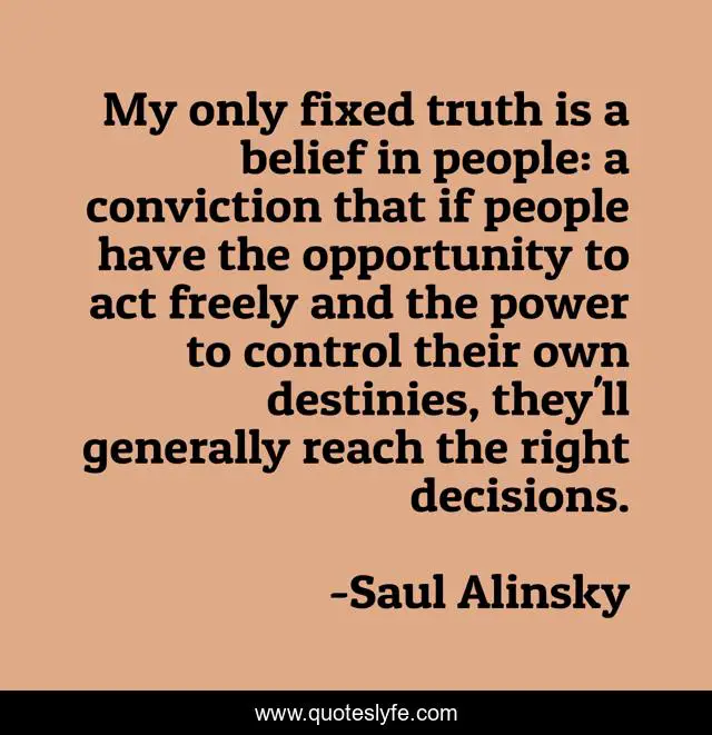 This page presents the quote "My only fixed truth is a belief in people: a conviction that if people have the opportunity to act freely and the power to control their own destinies, they'll generally reach the right decisions.". Author of this quote is Saul Alinsky. This quote is about opportunity, truth,.