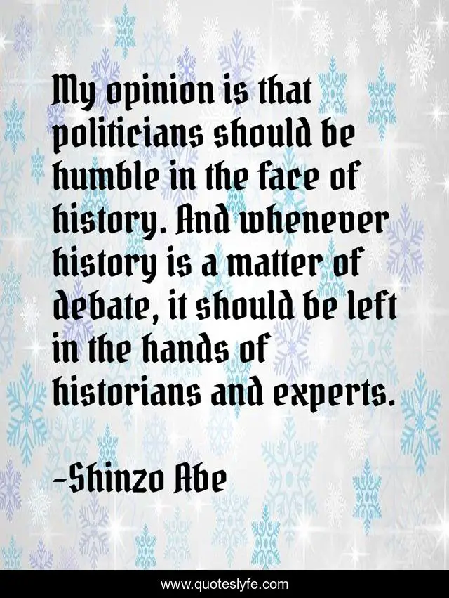 This page presents the quote "My opinion is that politicians should be humble in the face of history. And whenever history is a matter of debate, it should be left in the hands of historians and experts.". Author of this quote is Shinzo Abe. This quote is about opinion, humble, hands,.