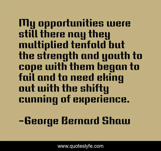 This page presents the quote "My opportunities were still there nay they multiplied tenfold but the strength and youth to cope with them began to fail and to need eking out with the shifty cunning of experience.". Author of this quote is George Bernard Shaw. This quote is about aging, age, old,.