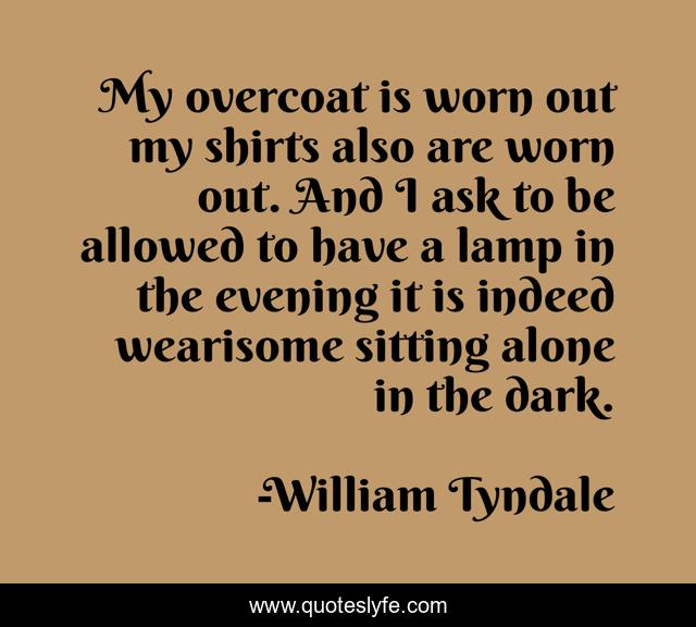 This page presents the quote "My overcoat is worn out my shirts also are worn out. And I ask to be allowed to have a lamp in the evening it is indeed wearisome sitting alone in the dark.". Author of this quote is William Tyndale. This quote is about dark, lamp, evening,.