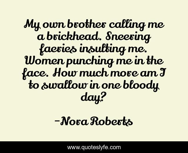 This page presents the quote "My own brother calling me a brickhead. Sneering faeries insulting me. Women punching me in the face. How much more am I to swallow in one bloody day?". Author of this quote is Nora Roberts. This quote is about funny, nora-roberts, faeries, romance, fantasy, ireland, comedy,.