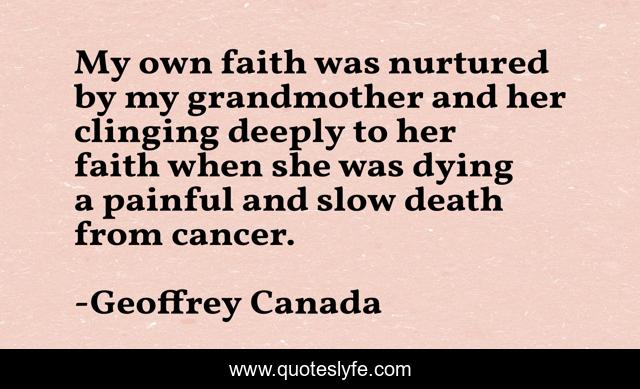 This page presents the quote "My own faith was nurtured by my grandmother and her clinging deeply to her faith when she was dying a painful and slow death from cancer.". Author of this quote is Geoffrey Canada. This quote is about death, slow, cancer,.