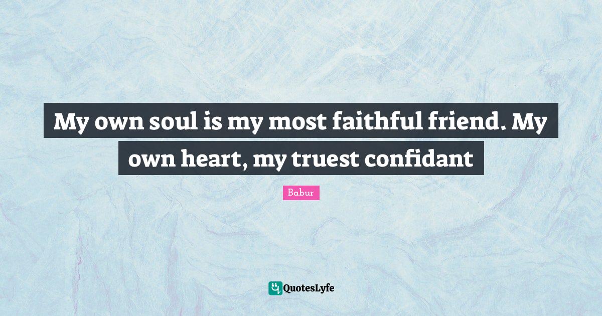 This page presents the quote "My own soul is my most faithful friend. My own heart, my truest confidant". Author of this quote is Babur. This quote is about soul, truest, my own, faithful, confidant, heart,.