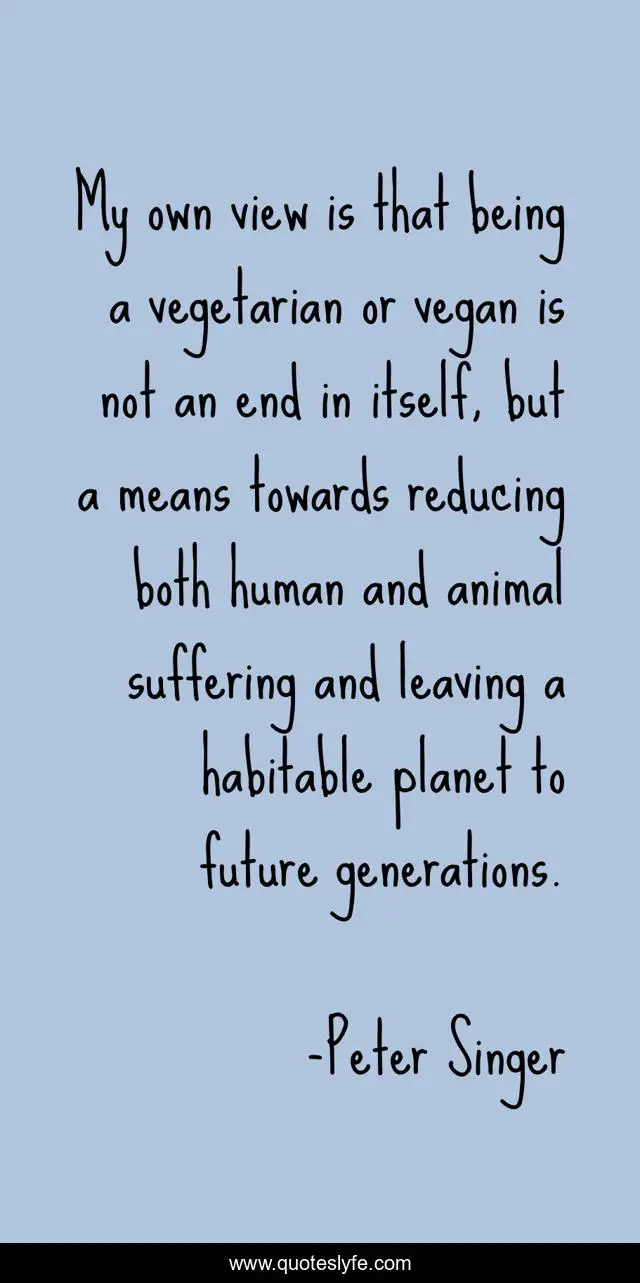 This page presents the quote "My own view is that being a vegetarian or vegan is not an end in itself, but a means towards reducing both human and animal suffering and leaving a habitable planet to future generations.". Author of this quote is Peter Singer. This quote is about suffering, animal, leaving,.