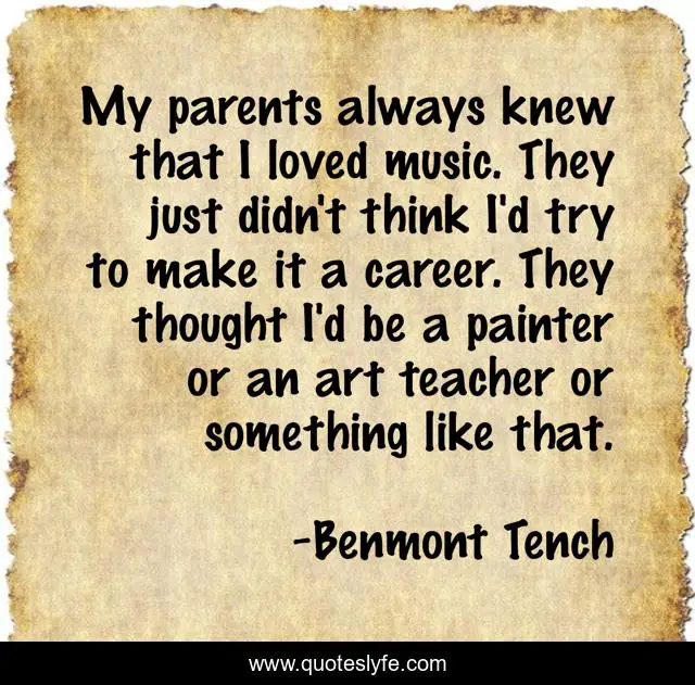 This page presents the quote "My parents always knew that I loved music. They just didn't think I'd try to make it a career. They thought I'd be a painter or an art teacher or something like that.". Author of this quote is Benmont Tench. This quote is about music, art, parents,.
