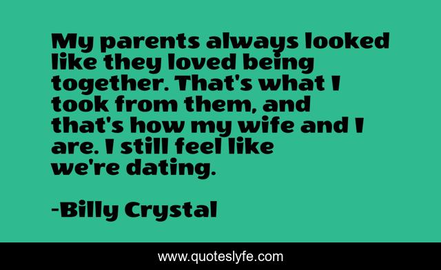 This page presents the quote "My parents always looked like they loved being together. That's what I took from them, and that's how my wife and I are. I still feel like we're dating.". Author of this quote is Billy Crystal. This quote is about parents, together, wife,.