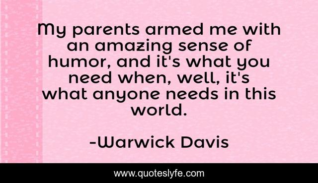 This page presents the quote "My parents armed me with an amazing sense of humor, and it's what you need when, well, it's what anyone needs in this world.". Author of this quote is Warwick Davis. This quote is about world, amazing, parents,.